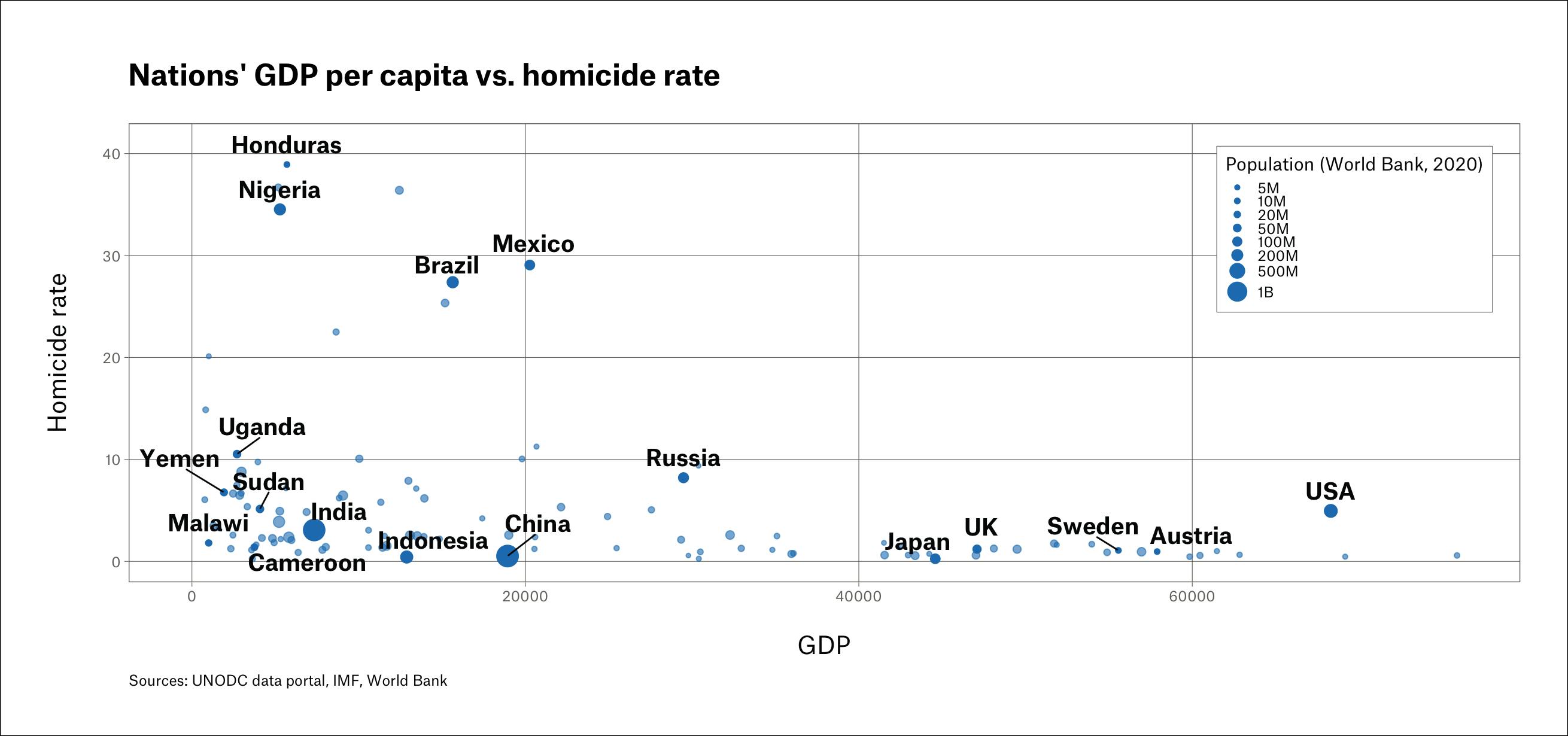 Homicide rates per 100,000 residents for selected countries plotted against Gross Domestic Product (GDP) per capita (adjusted for purchase power parity)