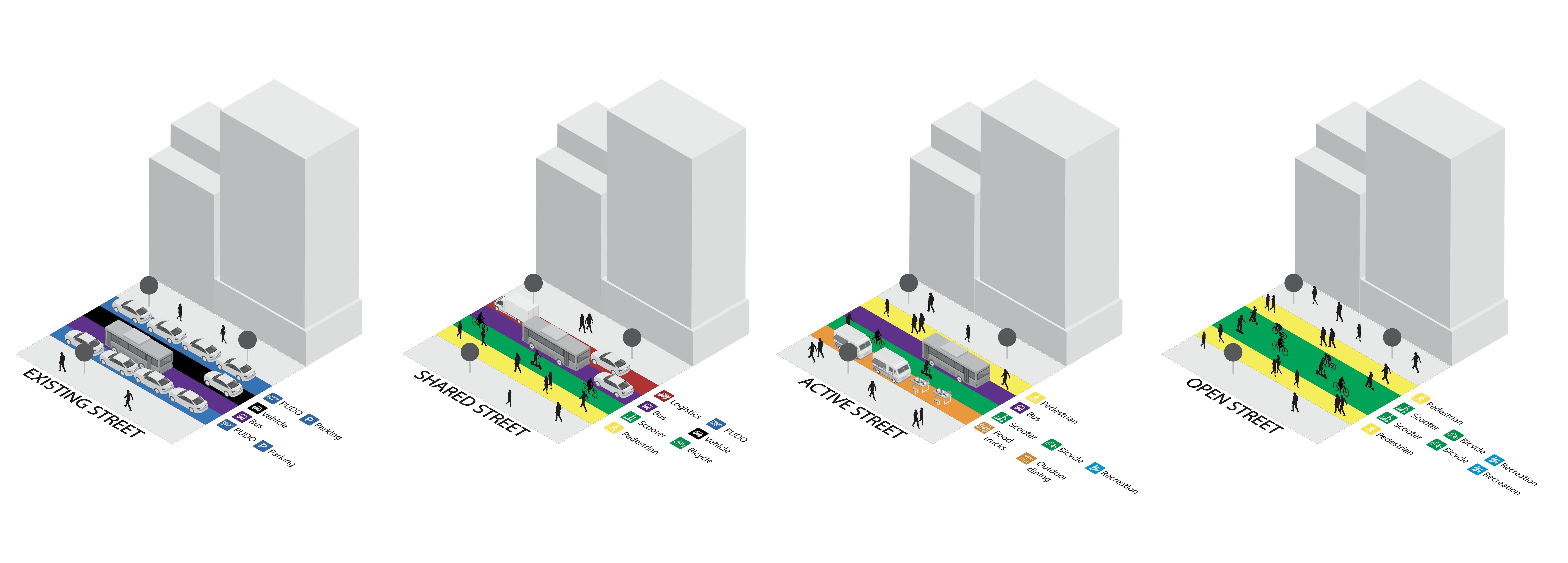 A lane adjacent to the sidewalk can be used as a dedicated bus lane during morning rush hours. Around lunchtime, the same lane could be turned into a greenway to facilitate connectivity to the surrounding neighborhood, with bike and micro-mobility modes. In the evening and during the weekend, the same space could be combined with adjacent modular lanes to make space for temporary programs such as art installations, events, sports and other recreational activities.