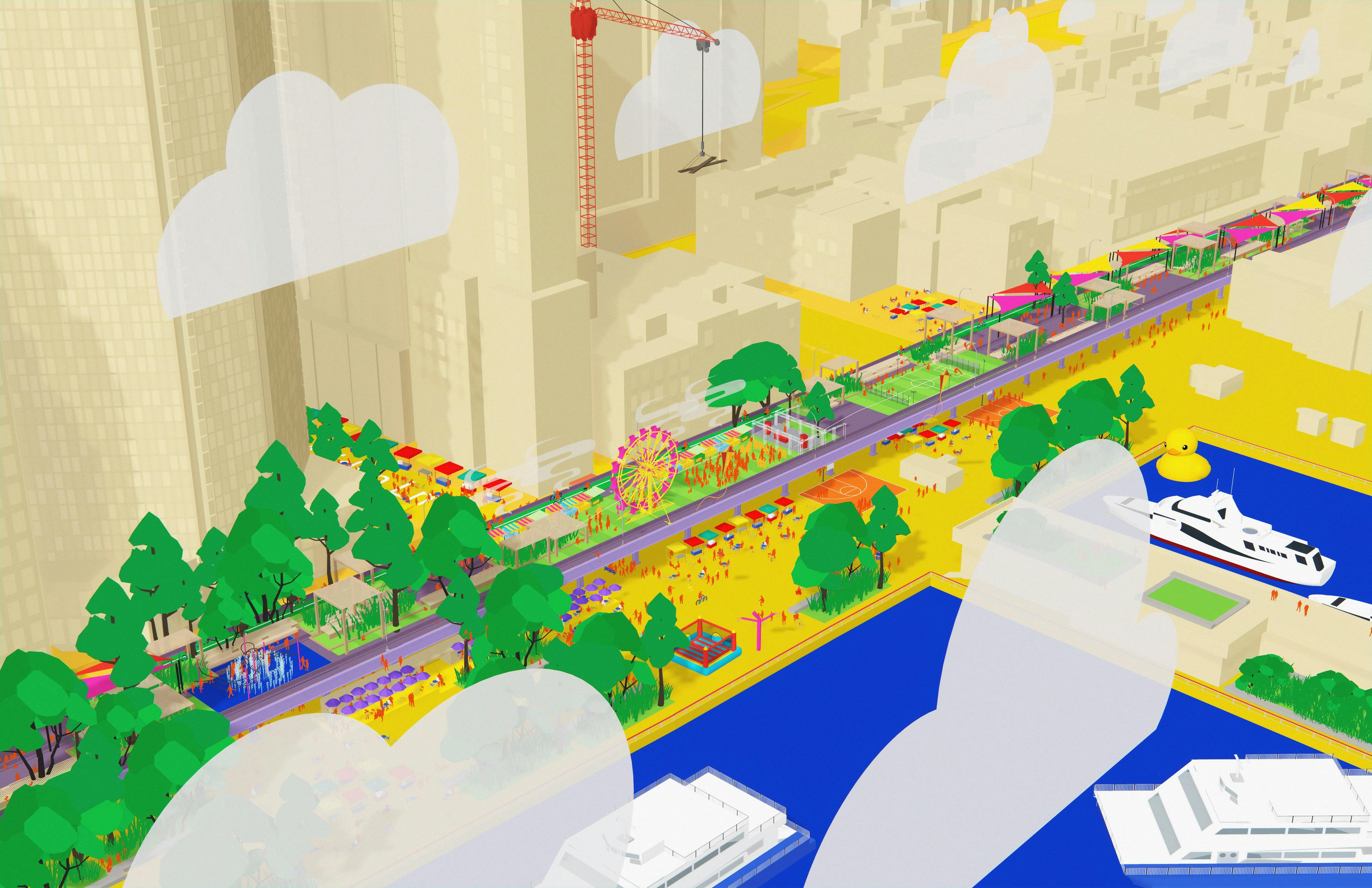 As part of an interconnected network of Urban Beachways, FDR Drive (shown here near the South Street Seaport) would be temporarily transformed into a seaside carnival for pedestrians. Part urban beach, part CicLAvia and part Coney Island. The one-day transformation would recreate the New York seaside summer on the legs of the highway, creating a new vantage point with an uninterrupted freeway for cyclists, rollerbladers, scooters, jitneys and joggers.