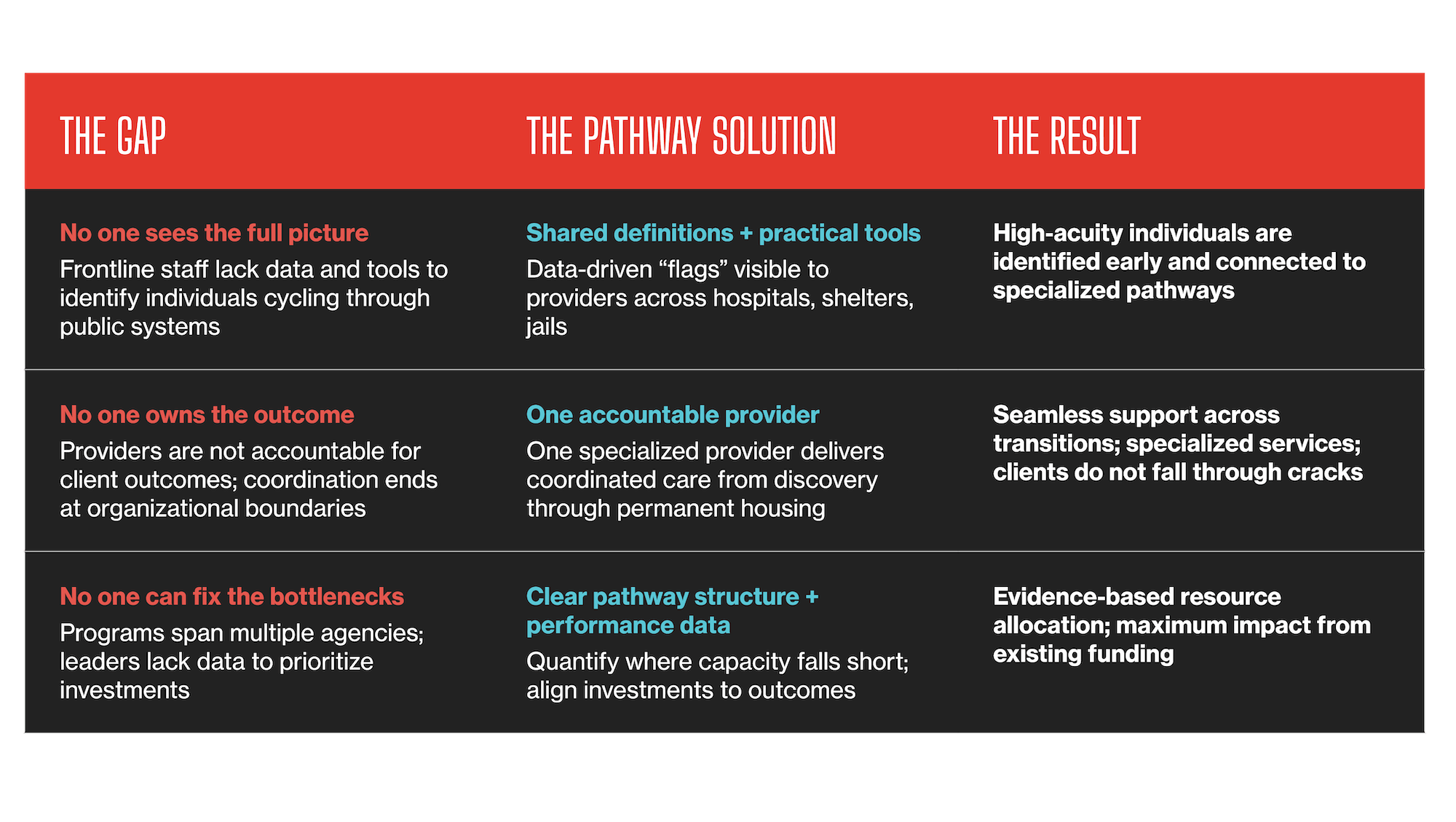 The service pathway model will also give providers the tools and shared criteria they need to recognize when someone is experiencing high-acuity homelessness and connect them to the right level of care. Today, frontline staff lack both a common definition and practical ways to identify these cases. Every time a person experiencing high-acuity homelessness walks into an emergency room or is discharged from a jail, this is an opportunity to intervene with a connection to robust support before the next crisis. Under the service pathway model, high-acuity cases are defined consistently across common crisis points. Data can then be linked and surfaced through existing systems to help route people to specialized services more quickly and effectively.