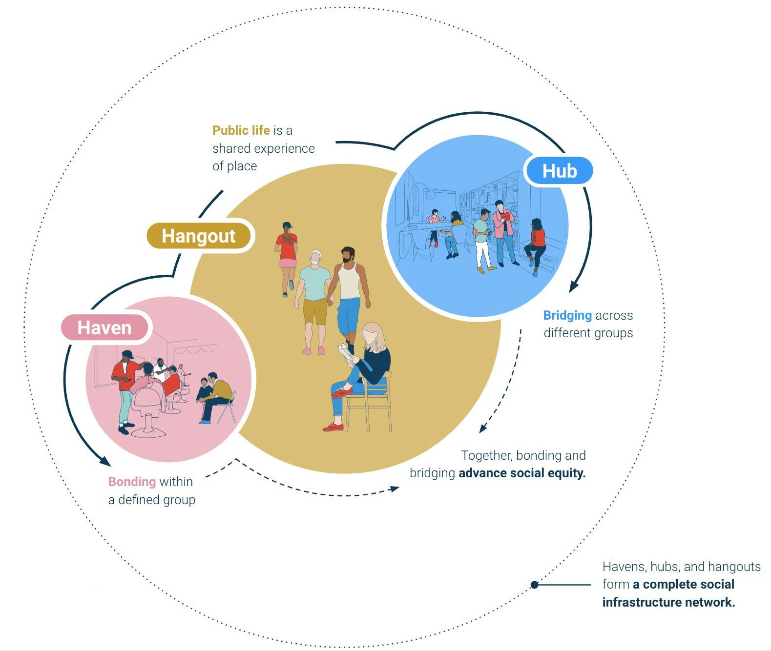 The social infrastructure that arises from shared public spaces creates opportunities for people to build relationships within and across differences in their communities. Bonding within a defined group is important for reinforcing a shared identity, which may be particularly important for members of marginalized communities to feel safe and understood. Bridging across different groups is important for decreasing polarization and building trust and tolerance in communities.