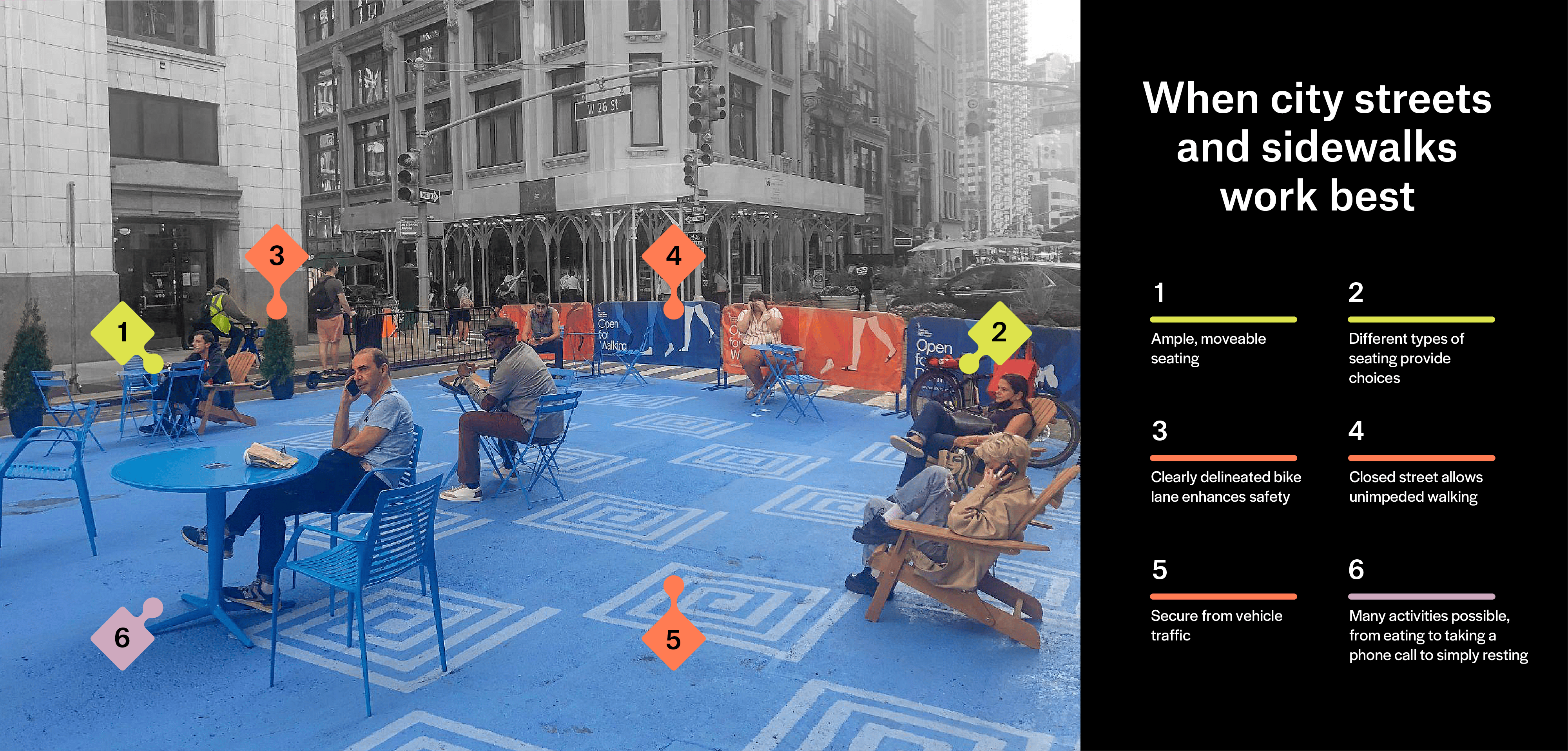 Now is the time to remember. COVID-19 lockdowns exposed how often unnecessary large, big-floorplate offices were, while at the same time highlighting how essential the public realm is to healthy urban existence. In an April 2020 global survey on public space usage that received responses from 40 U.S. states, 68 countries and every continent (save Antarctica), Gehl Studio (where I work) found that 87% of more than 2,000 respondents said the top public space destination was their neighborhood street and sidewalk. Thriving city life requires adapting streets and sidewalks that are dull, burdened with heavy traffic or unsafe, into inviting places that reduce vehicle traffic and create more space for walking, enjoying the outdoor urban environment — whether to take care of practical needs like commuting or to enjoy leisure activities — and connecting with others.