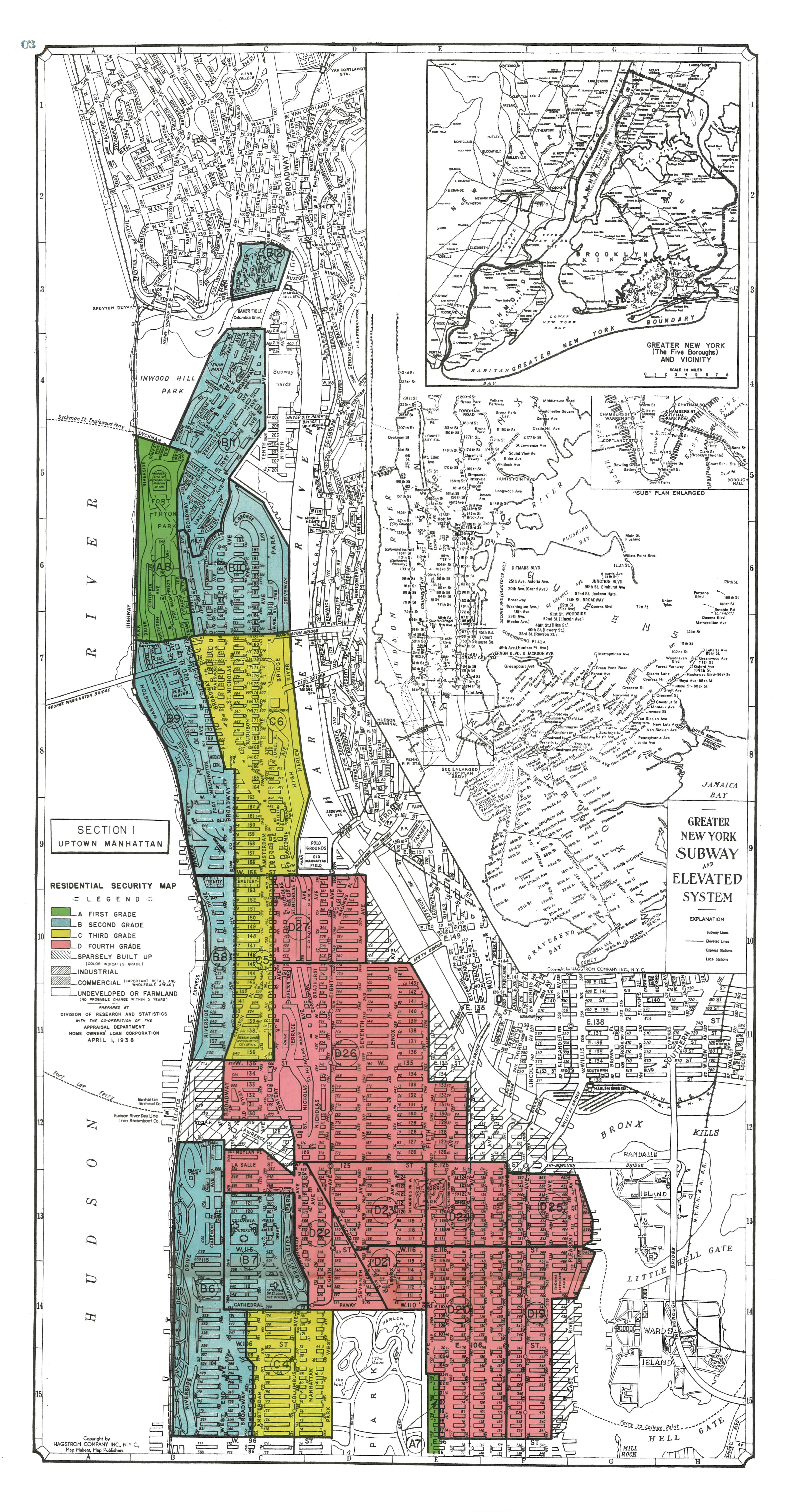 Unfortunately, as the quotes above document, these policies were segregationist by design, penalizing people and communities of color across the United States and encouraging white families to flee cities for segregated, suburban neighborhoods. HOLC created a system of grades to guide banks as they determined whether to extend loans to prospective borrowers. The grades were color-coded: A ("Best" and colored green), B ("Still Desirable," blue), C ("Declining," yellow), and D ("Hazardous," red). The appraisers who were employed by HOLC to create these maps based the grades on housing characteristics, economic and environmental conditions, transit access and — arguably more than anything else — the racial and ethnic makeup of a neighborhood's residents.
