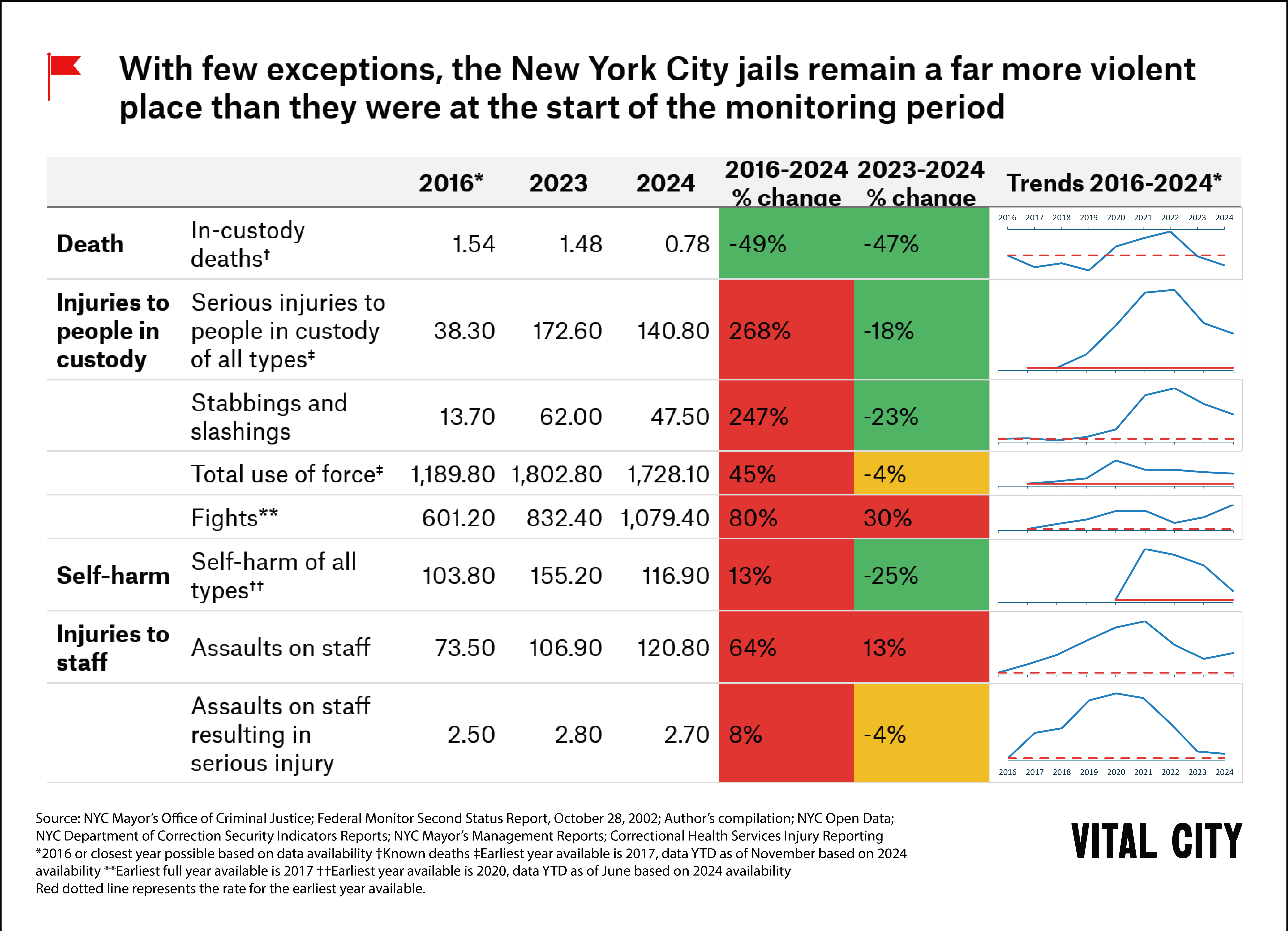 We offer this report to document where the jails are, as we have done regularly, and to assist anyone engaged in the project of diagnosing and fixing the jails with some basic information on the conditions inside. By almost all metrics, violence in the jails is elevated well above the already unconstitutional levels that marked life inside when the City first entered into a consent decree with the federal government in 2015. Rates of violence among people in custody, against people in custody by staff, and against staff by people in custody are all up, often by astronomical levels. While matters have improved in some areas between 2023 and 2024, the improvement is an extraordinarily modest reduction compared to the overall deterioration in conditions since 2016. In other areas, progress has stalled or conditions are worse: Both fights and assaults on staff were more common in 2024 than they were in 2023.